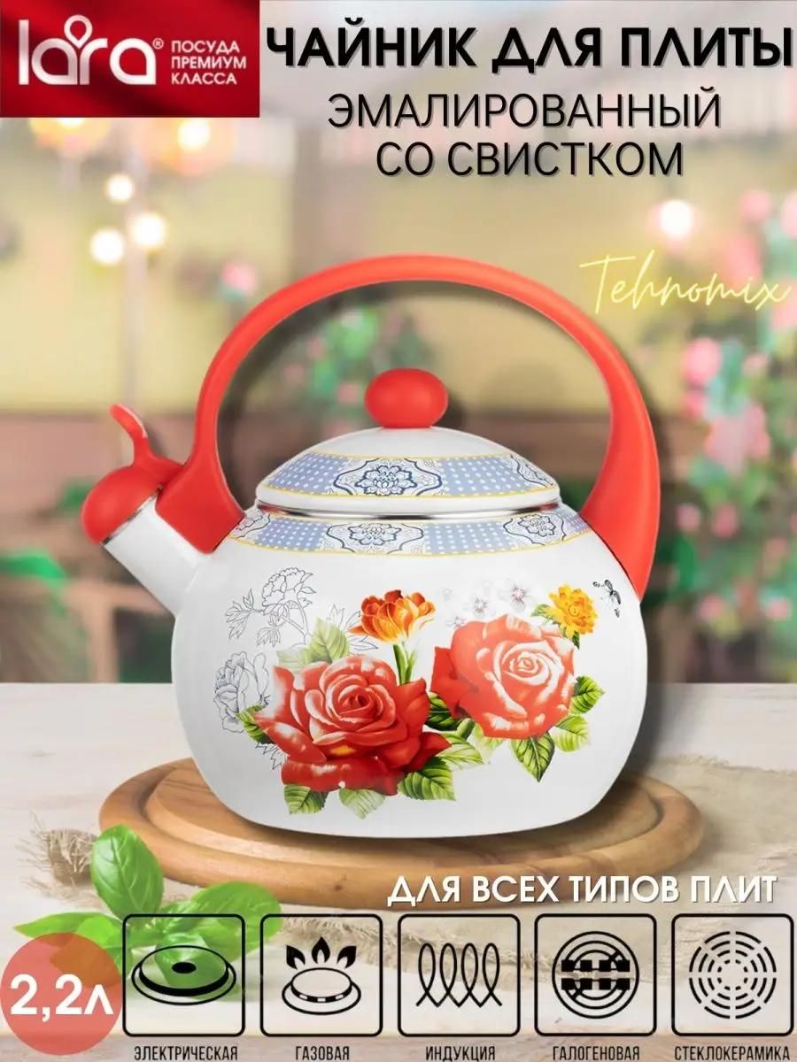 Чайник со свистком для плиты отличается высоким качеством. Гладкая не пористая поверхность посуды обеспечивает простой и легкий уход. Уникальный дизайн посуды LARA украсит любую кухню и создаст атмосферу домашнего уюта. Чайник эмалированный подойдет в подарок на любой праздник. Несмотря на широкий выбор электрочайников, старый-добрый чайник для плиты создает атмосферу уюта и тепла во время чаепития. Современный дизайн сочетается с любым интерьером, уместно смотрится дома или на даче, отдыхе на природе. Чайник для газовой плиты быстро закипает, обладает высокой износостойкостью. Удобная ручка из пластика не нагревается во время кипения, не скользит. Металлический чайник плотно закрывается крышкой, что защищает от ожогов паром. Вы можете заняться своими делами, а свисток на носике чайника "позовет" вас громким свистом, когда вода закипит. Он не требует отдельного места, его можно оставлять прямо на плите. При правильном уходе чайник для плиты со свистком прослужит долгое время и будет радовать вас горячими напитками! В нашем каталоге вы можете найти для себя другие эмалированные чайники и кастрюли.
