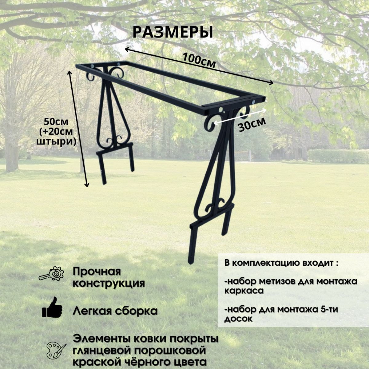 Каркас лавки с элементами ковки изготовлены из профильной трубы и покрыты глянцевой порошковой краской черного цвета. Сиденье не входит в комплект.