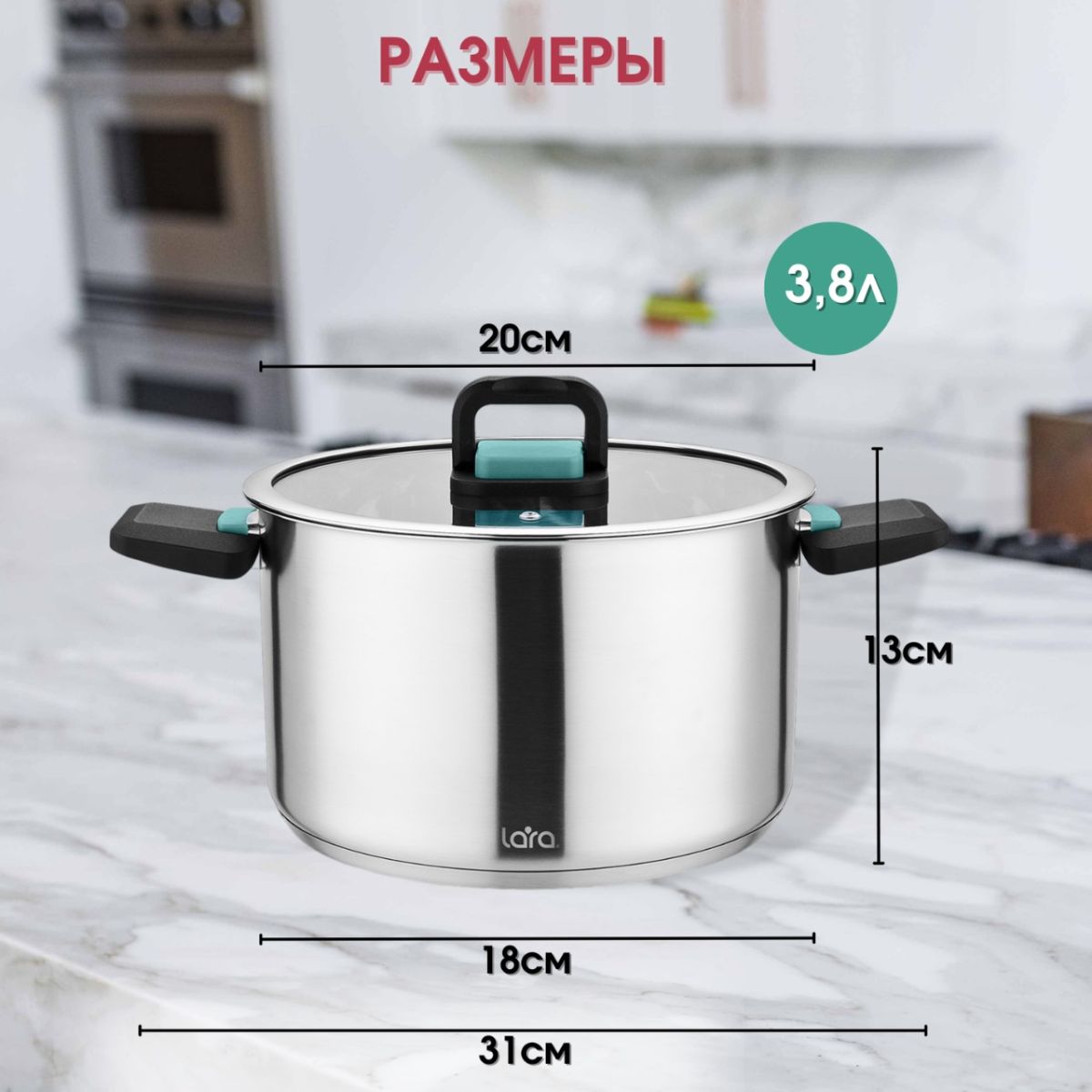 Кастрюля из нержавеющей стали LARA серии Изумруд в современном дизайне придется по душе любой хозяйке. Уникальность серии заключается в складных ручках- ручки на кастрюле и крышке складываются, делая кастрюлю максимально удобной при хранении. На крышке есть ободок из нержавеющей стали и паровыпуск.