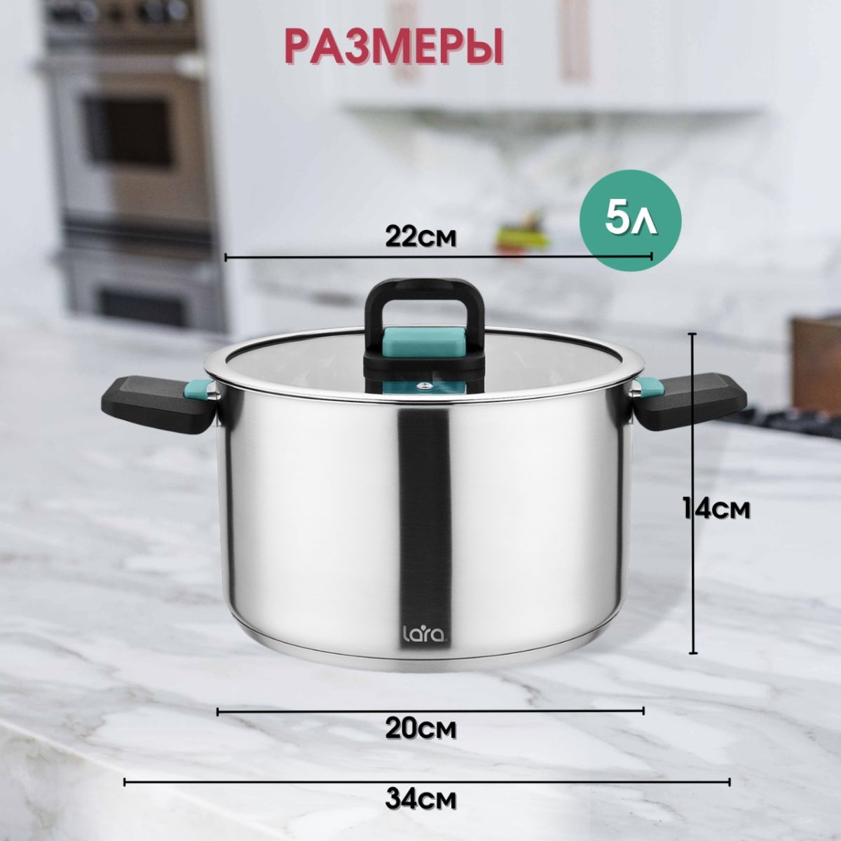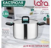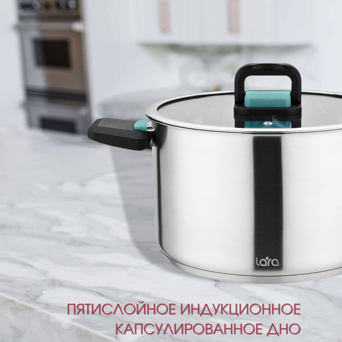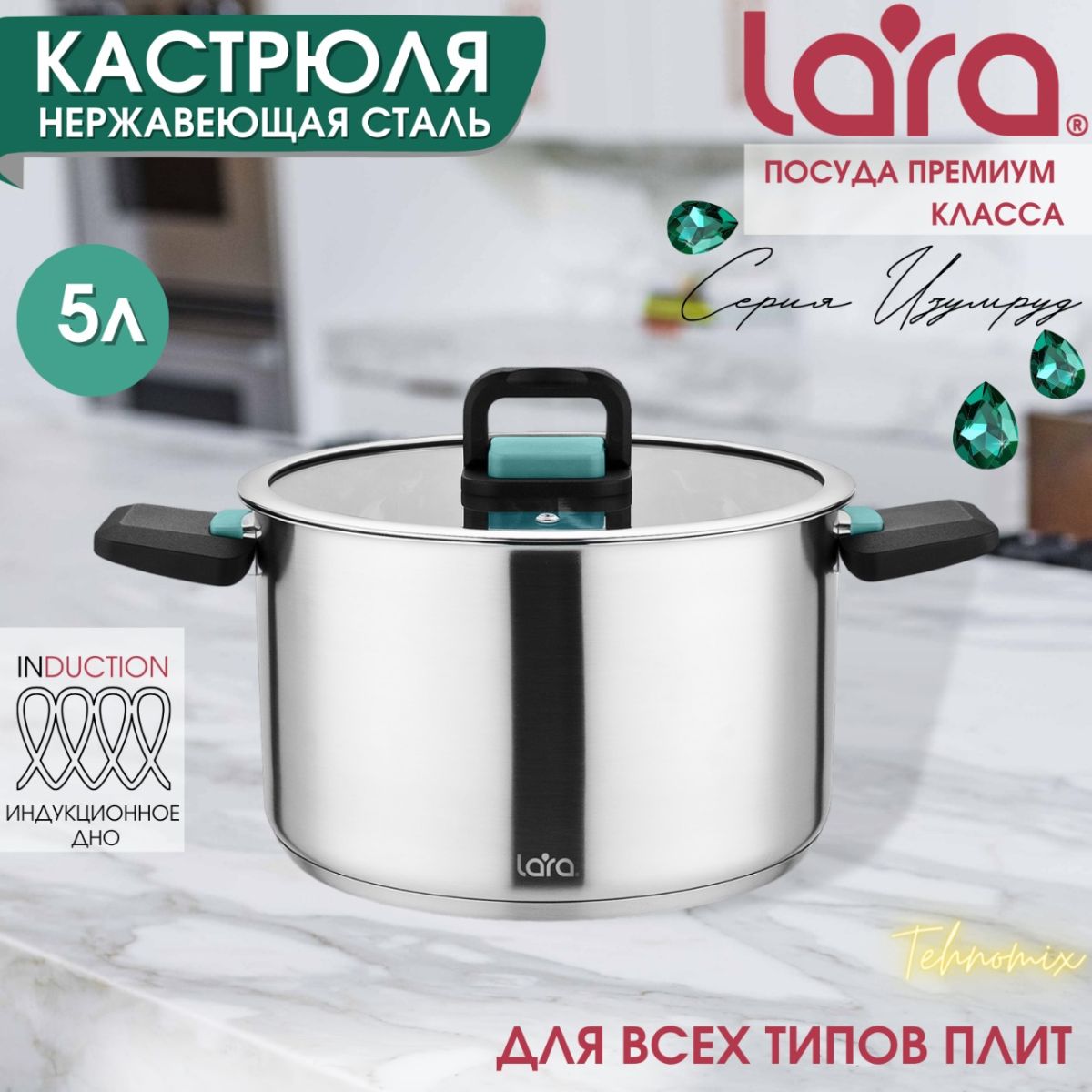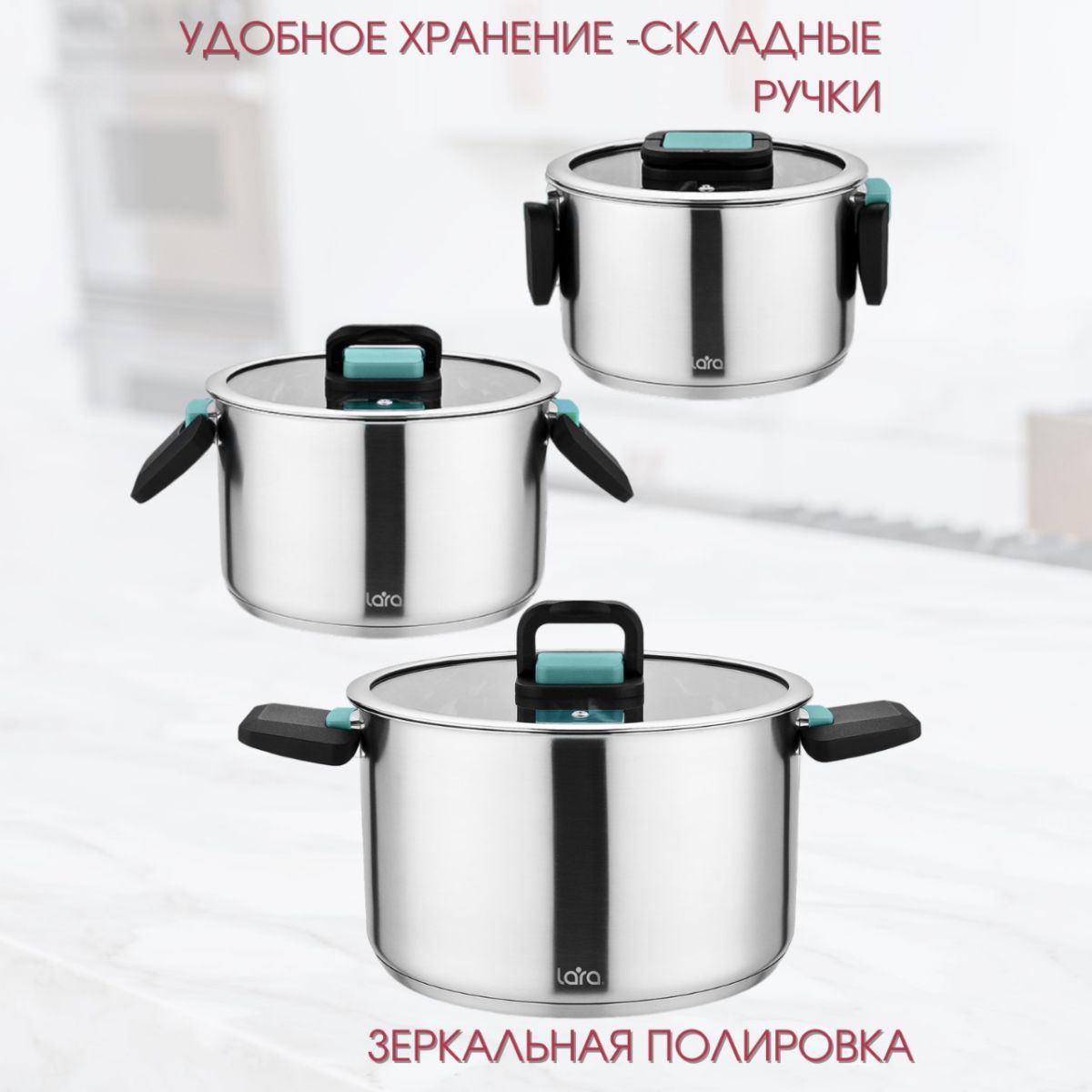 Кастрюля из нержавеющей стали LARA серии Изумруд в современном дизайне придется по душе любой хозяйке. Уникальность серии заключается в складных ручках- ручки на кастрюле и крышке складываются, делая кастрюлю максимально удобной при хранении. На крышке есть ободок из нержавеющей стали и паровыпуск.