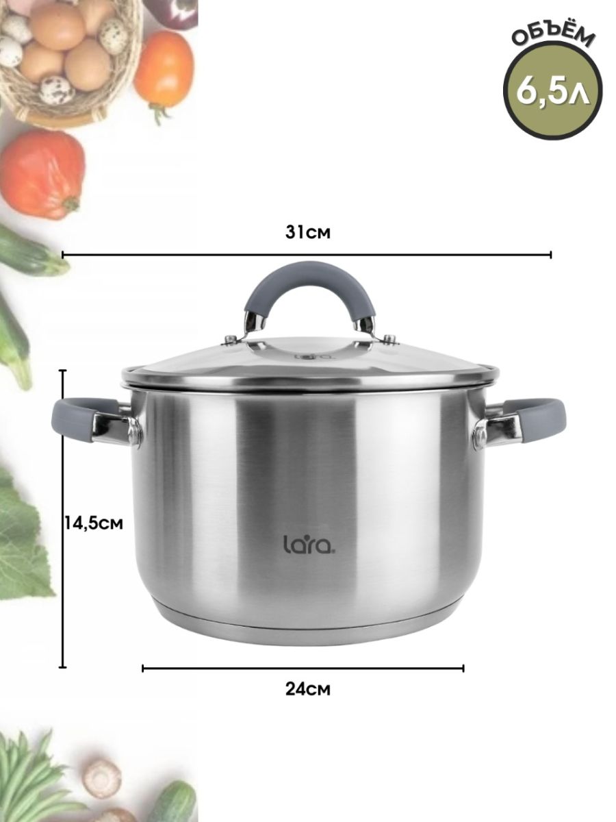 Кастрюля LARA АФИНА 02-270 ЛИК 6,5л, капсулированное индукционное дно, стеклянная крышка