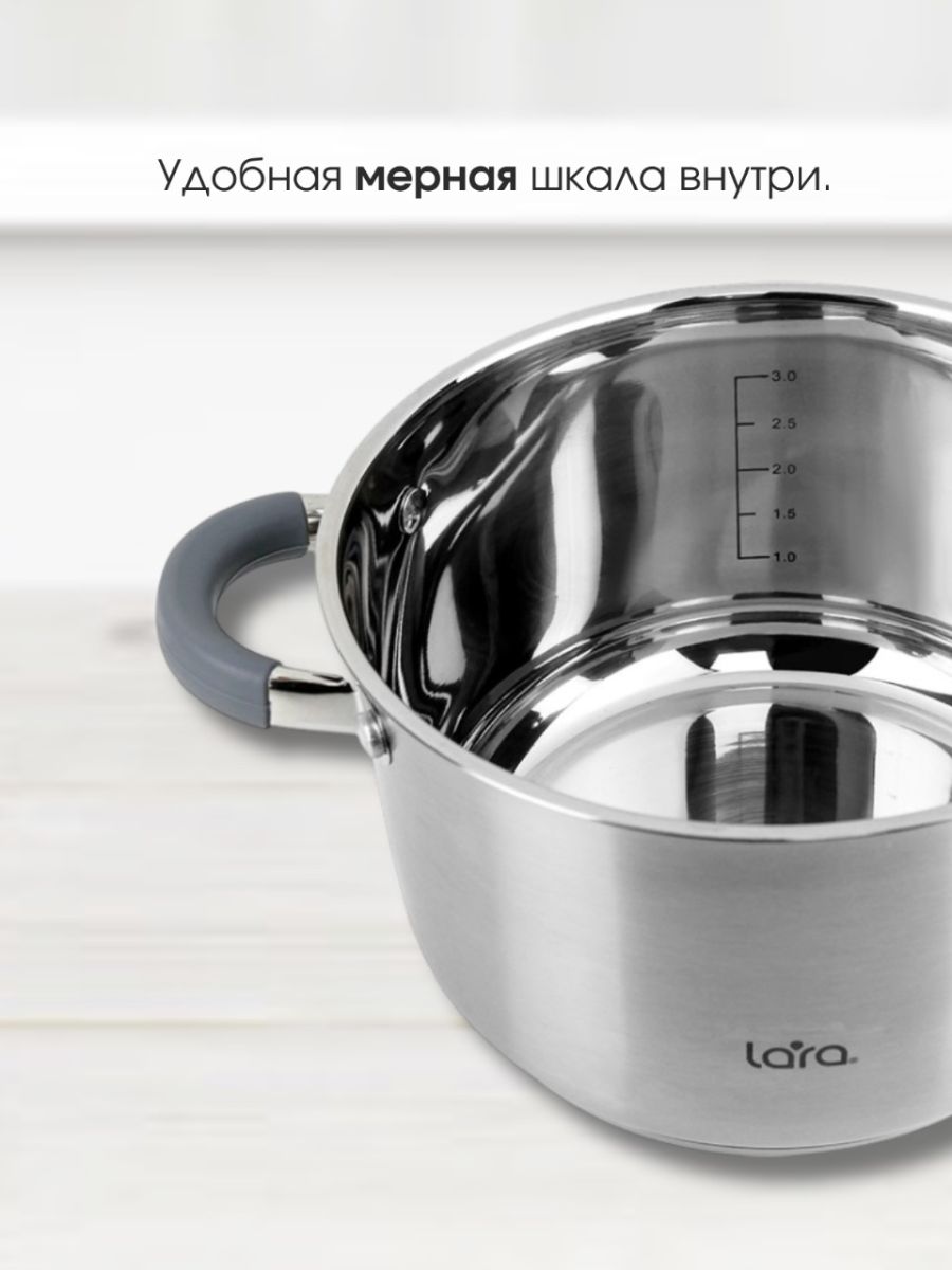 Кастрюля из нержавеющей стали на 3,9 литра со стеклянной крышкой с паровыпуском Lara . Ручки имеют термоупорное силиконовое покрытие. Маленькая кастрюлька- незаменимая помощница на кухне любой хозяйки и имеет толстое пятислойное капсульное дно, благодаря чему происходит равномерное распределение тепла и еда не пригорает к стенкам кастрюли.