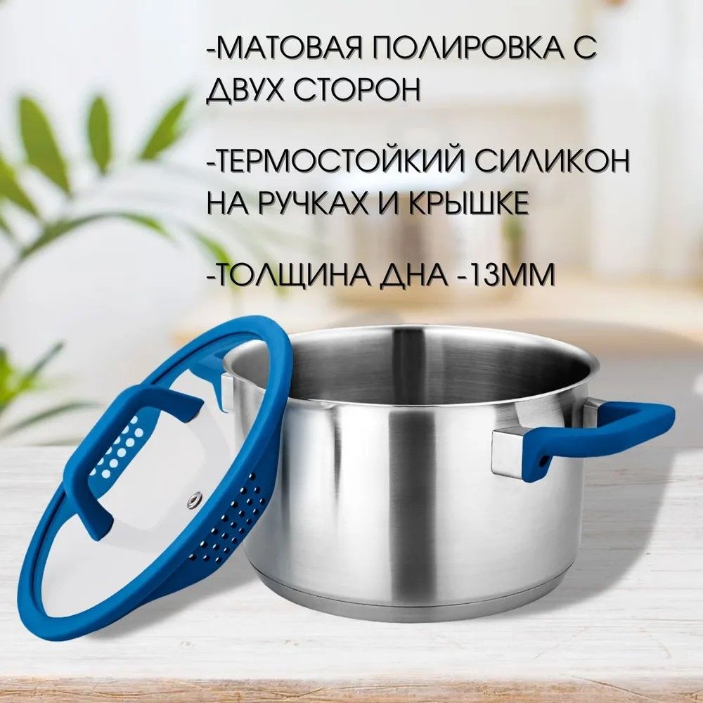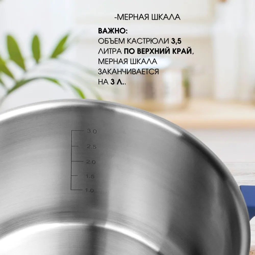 Кастрюля из нержавеющей стали AISI 201 3,5 литра с носиком для слива жидкости- встроенный дуршлаг. Удобная кастрюля со стеклянной крышкой,с уникальной конструкцией - встроенный дуршлаг (крышка-дуршлаг)с отверстиями для слива диаметром 3 мм и 6 мм. Внутри кастрюли мерная шкала. Кастрюля оснащена двумя удобными ручками из нержавеющей стали с силиконовым покрытием soft-touch из термостойкого пищевого силикона. Ручки не перегреваются во время приготовления при правильном положении изделия на плите. Крышка, выполненная из термостойкого стекла, позволит вам следить за процессом приготовления пищи