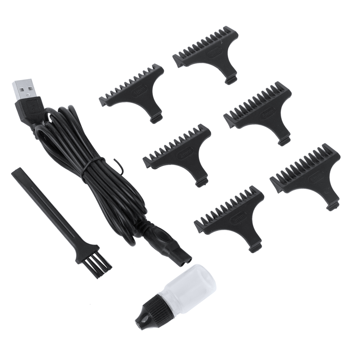 USB-зарядка, Кисточка для чистки лезвия, Масло, Насадка-гребень (6 шт.)