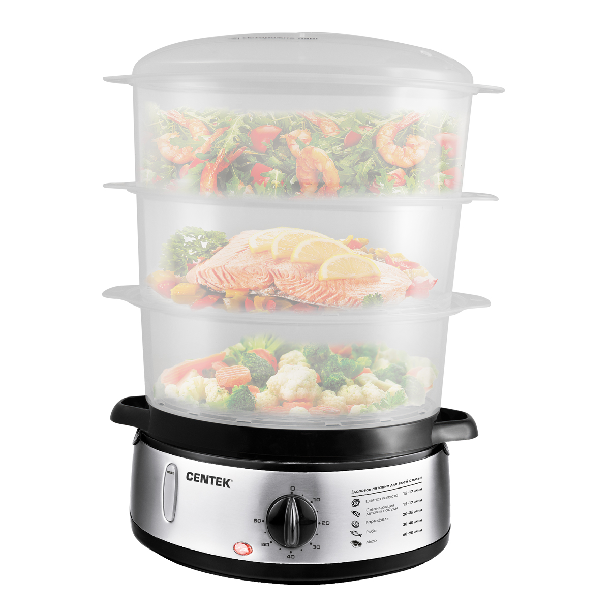 Пароварка Centek СТ-1457 для приготовления вкусной и здоровой пищи. Три чаши общим объемом 9 литров и специальная чаша для варки риса дают возможность одновременного приготовления нескольких блюд. Резервуар для воды объемом 1,2 литра имеет функцию добавления воды во время приготовления. Пароварка имеет механическое управление, при помощи которого очень просто задавать все необходимые параметры для приготовления пищи на пару. Функция таймера позволит установить желаемое время приготовления продуктов в пароварке до 60 минут, и вам не нужно будет контролировать ее работу вплоть до момента готовности. Пароварка снабжена надежной системой защиты прибора, исключающей возможность опасных ситуаций, связанных с недостаточным количеством воды. Благодаря стальному корпусу пароварка хорошо защищена от внешних воздействий и имеет длительный срок службы.