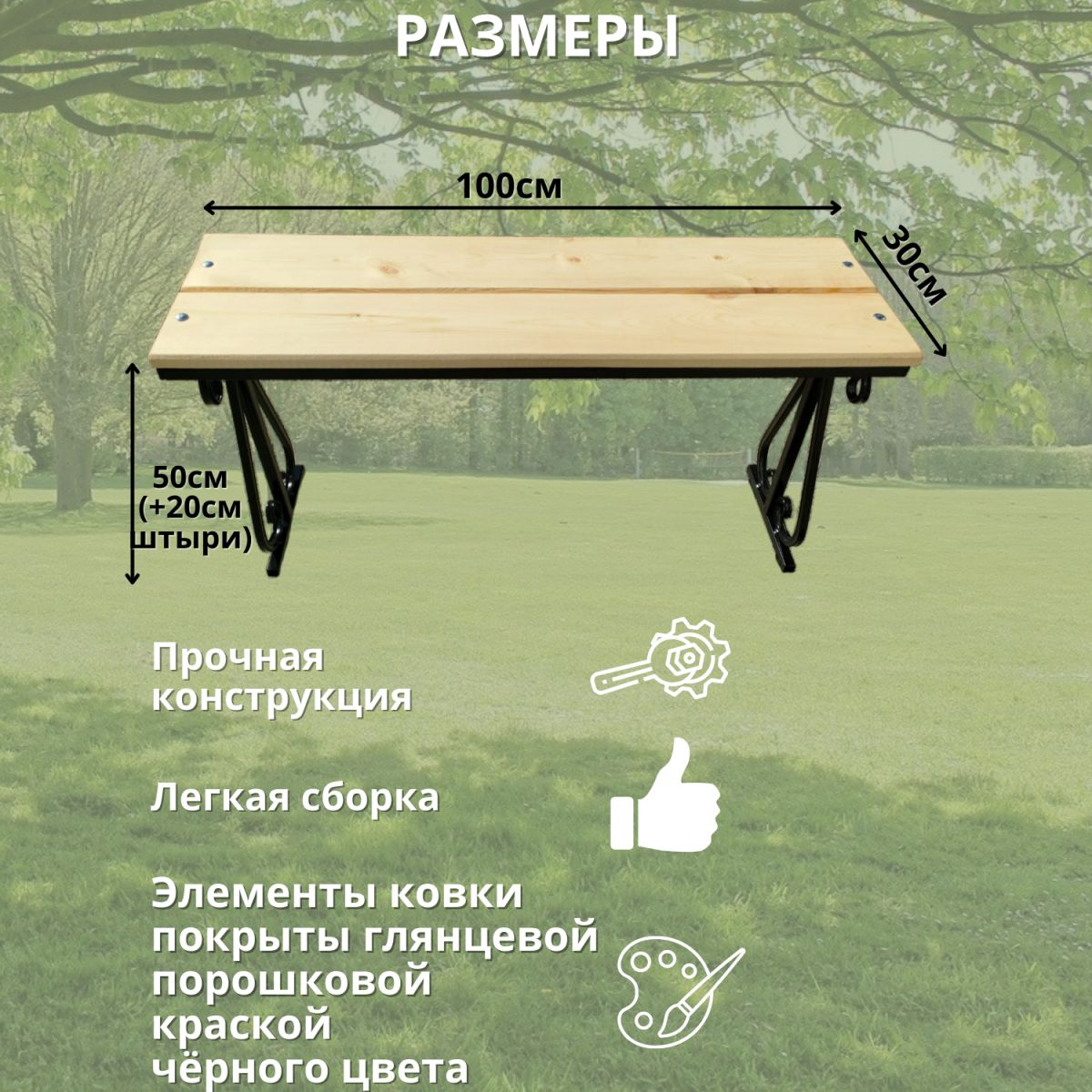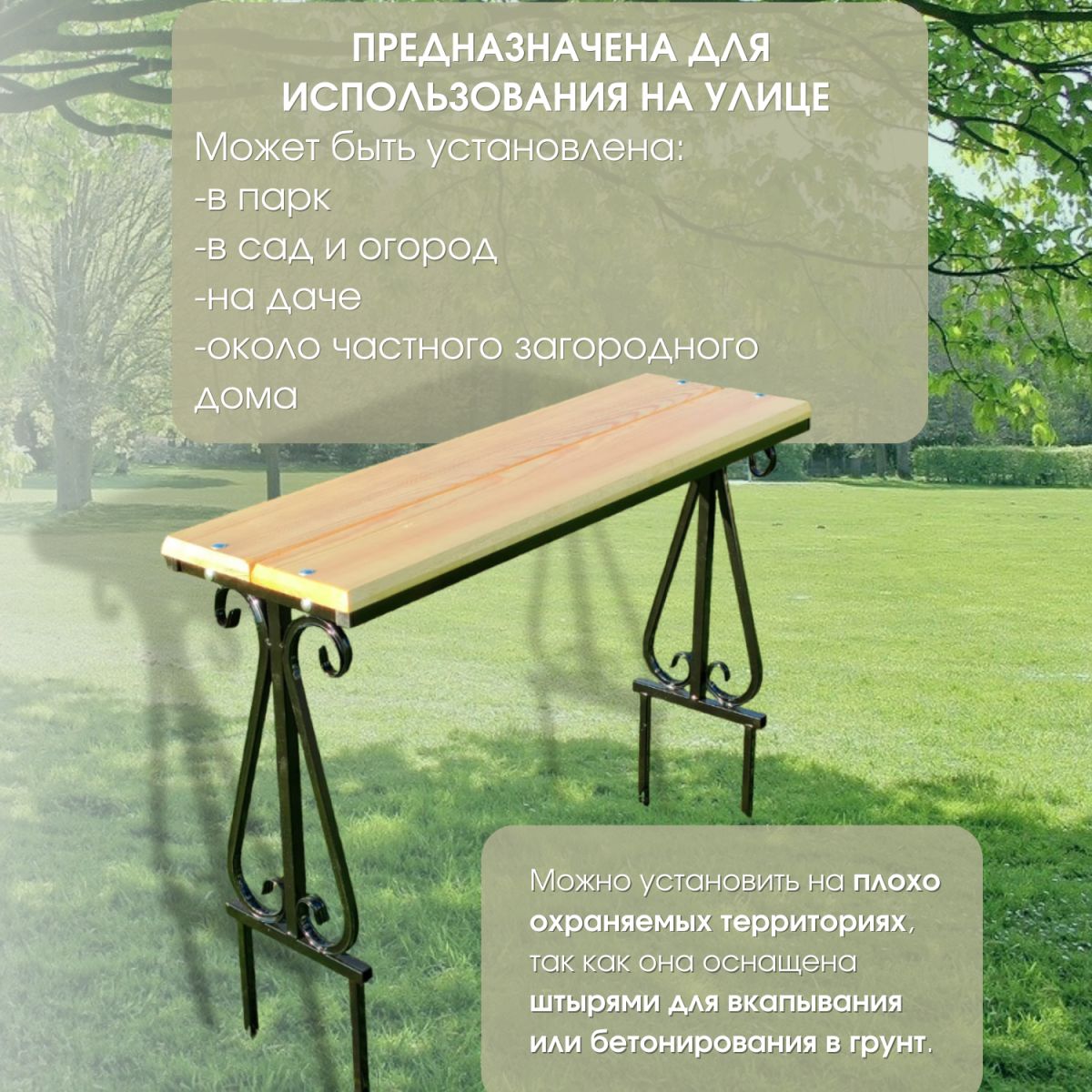 Садовая мебель актуальна уже сейчас, так как приближается сезон сада и огорода. Лавка металлическая садовая парковая оснащена штырями для вкапывания в грунт поэтому она отлично подойдет для установки на неохраняемых или плохо охраняемых территориях. Каркас лавки с элементами ковки изготовлены из профильной трубы и покрыты порошковой краской. Садовые скамейки из дерева - долговечный вариант дачной мебели для отдыха на природе. Лавочка проста в сборке, инструкция идет в комплекте. Детали лавки крепятся на болты, надежно фиксируя всю конструкцию. Скамья садовая подойдет не только для садового участка, но и в качестве мебели для бани, для прихожей в частном доме, а также для кемпинга. Деревянная мебель является не только надежной, но и безопасной. Скамья садовая благодаря стильному дизайну, станет отличным дополнением вашего участка. Сиденье выполнено из хвойного массива сосны, отшлифовано, для того, чтобы вы могли покрасить скамью сами на свой вкус и цвет, мы не покрываем эту модель лаком. Длина лавочки 100 см, ширина 30 см, высота 50 см +20 см на штыри. Перед отправкой клиенту мы тщательно проверяем каждую позицию нашего заказа, будьте уверены в качестве нашей сборки. Поставляется в разобранном виде в картонной коробке.