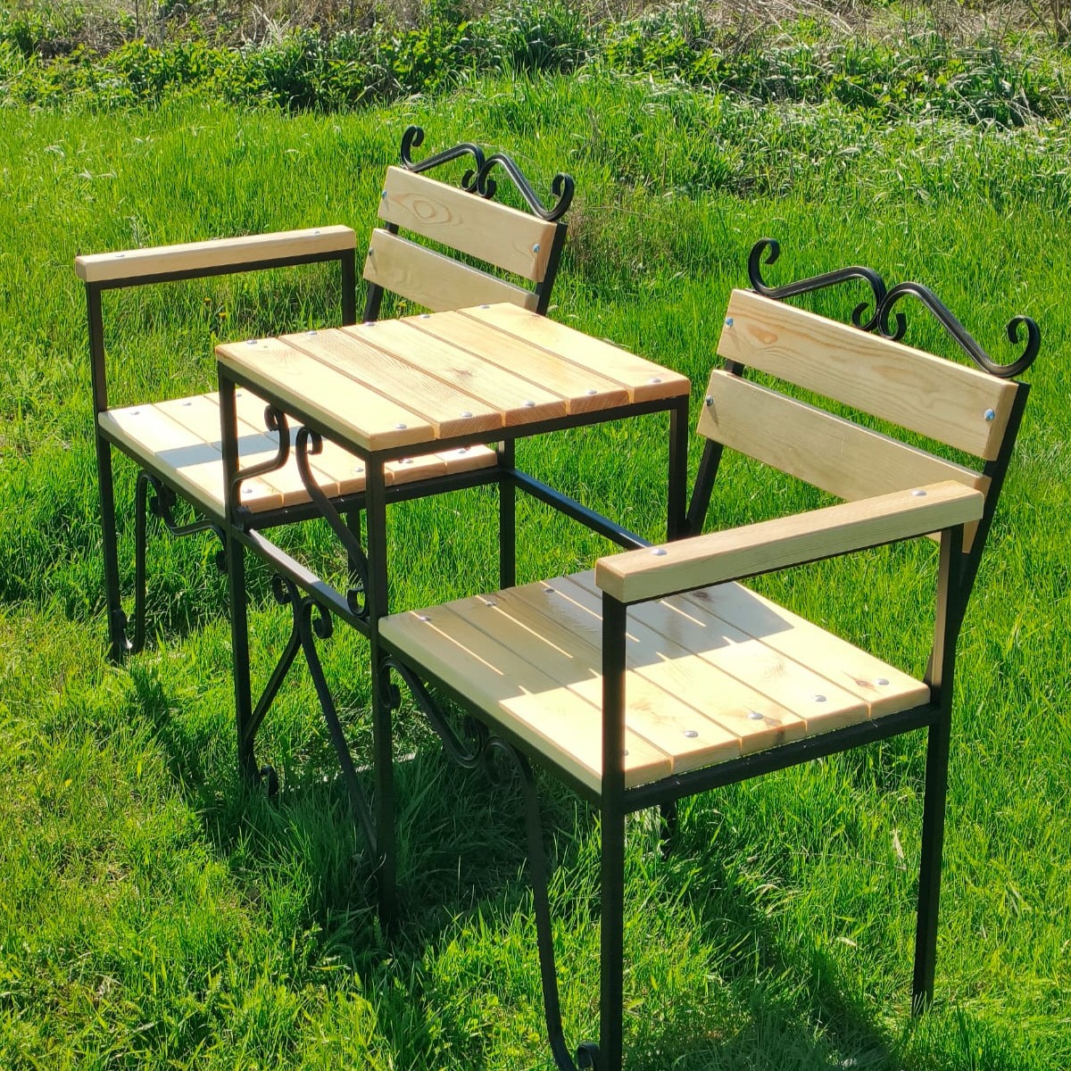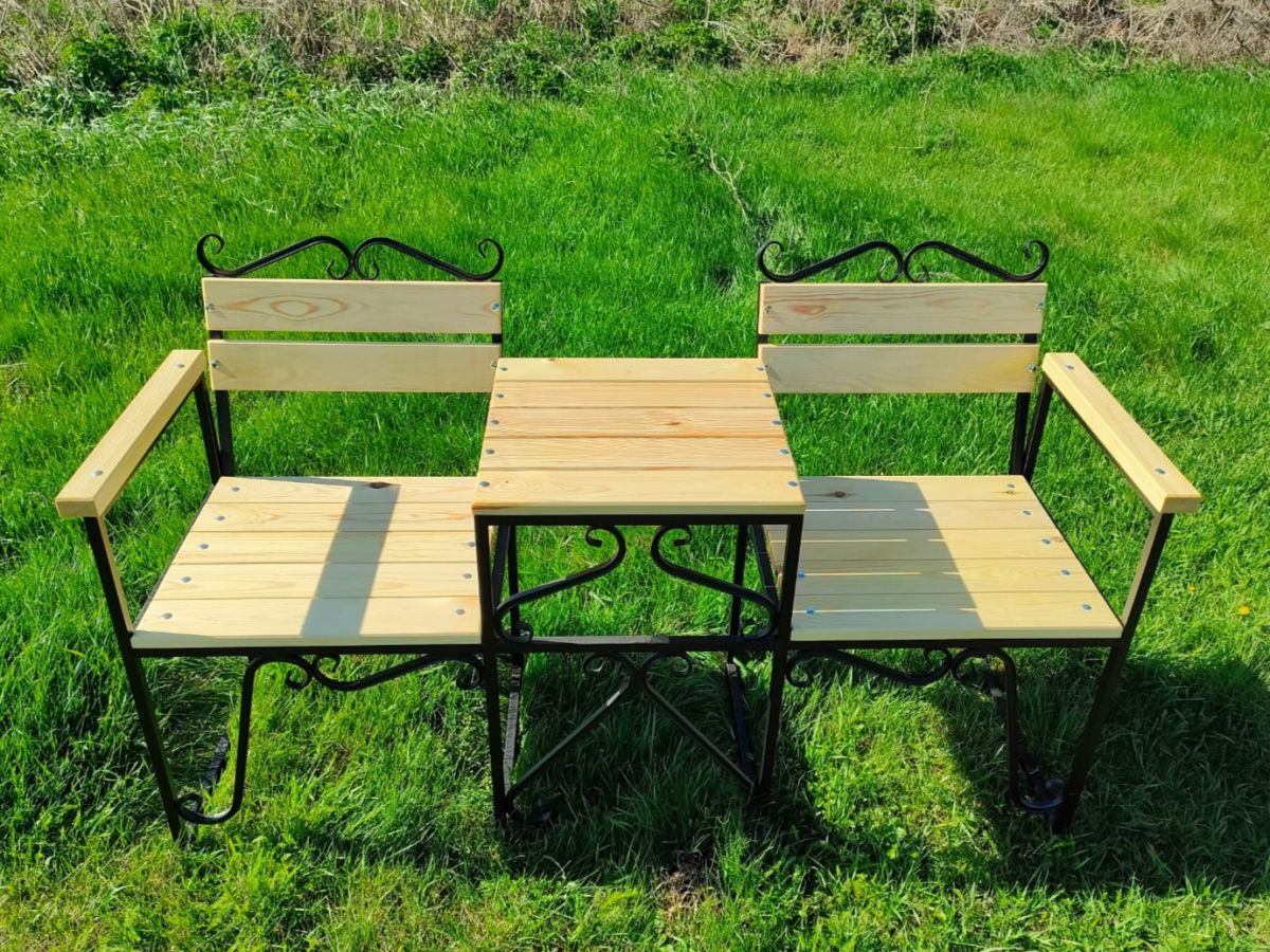 Скамейка изготовлена из прочного металлического каркаса и натурального дерева.