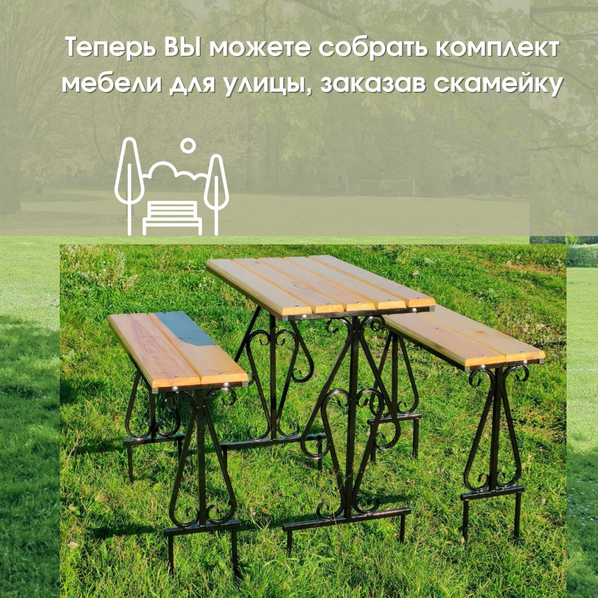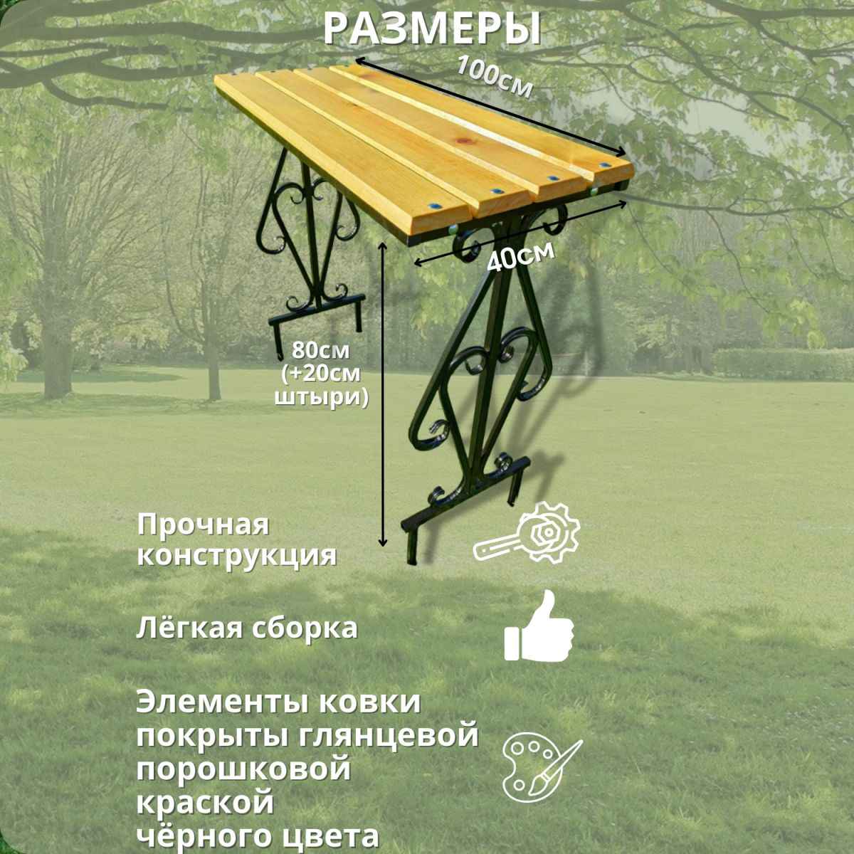 Стол садовый металлический, предназначен для использования на улице. Садовый стол может быть установлен в парк, в сад и огород, около частного загородного дома. Стол уличный можно установить на плохо охраняемых территориях, таких как кладбище. Стол дачный уличный оснащен штырями для вкапывания или бетонирования в грунт. Каркас стола с элементами ковки изготовлен из профильной трубы и покрыт глянцевой порошковой краской черного цвета. Столешница выполнена из хвойного дерева (сосна), отшлифована, без обработки. Конструкция стола разборная. Состоит из 4 элементов: столешница в сборе, 2 боковины и крепления. Поставляется в картонной коробке, благодаря этому стол придет к вам в целости и сохранности. Длина стола 100 см, ширина 40, высота 80 см + 20 см штыри. Вес 9,7 кг. Так же можно приобрести скамейки из этой коллекции и у Вас получится отличный и практичный комплект.