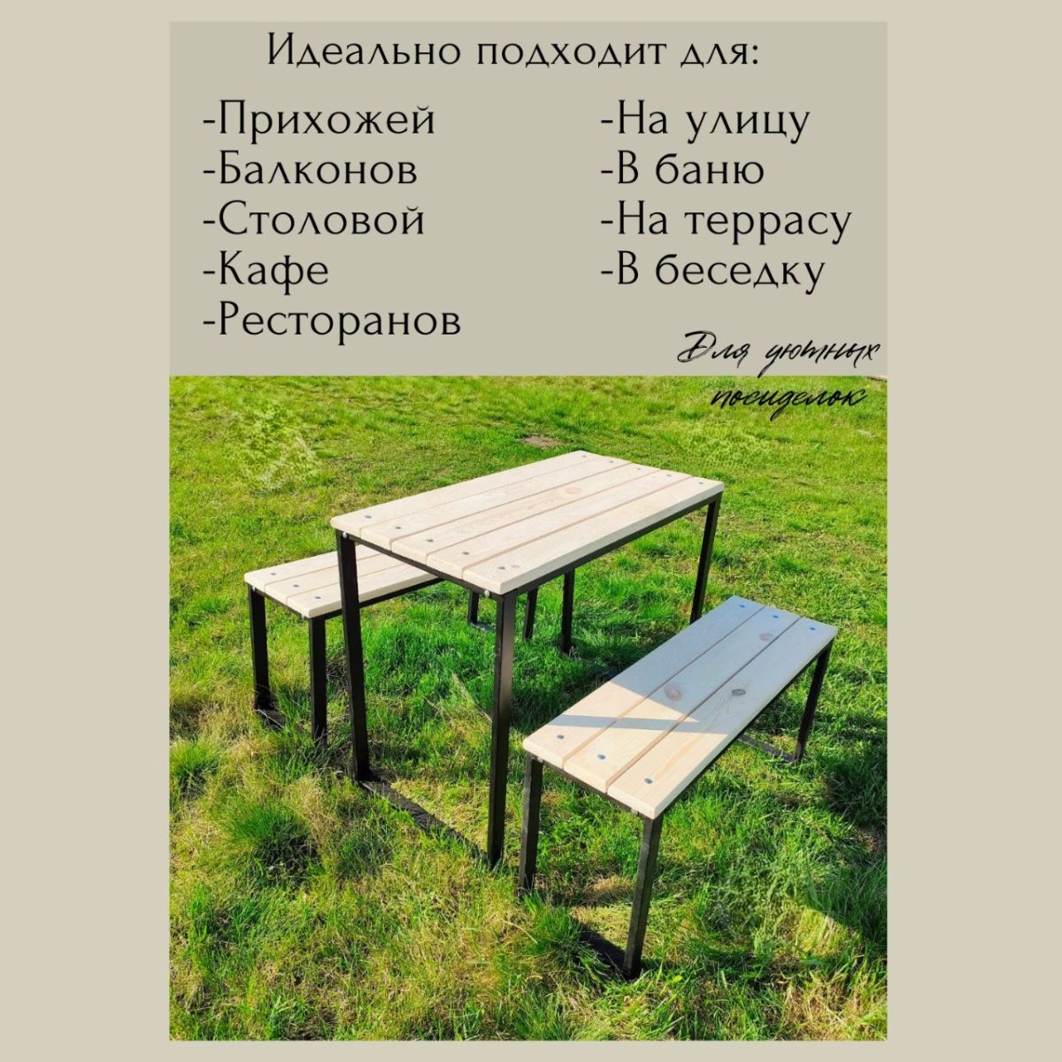 Можно использовать как дачную мебель для отдыха на приусадебном участке или уличный стол и лавочку для городского парка или сквера. Это отличный выбор садовой мебели для тех, кто любит проводить время на свежем воздухе.