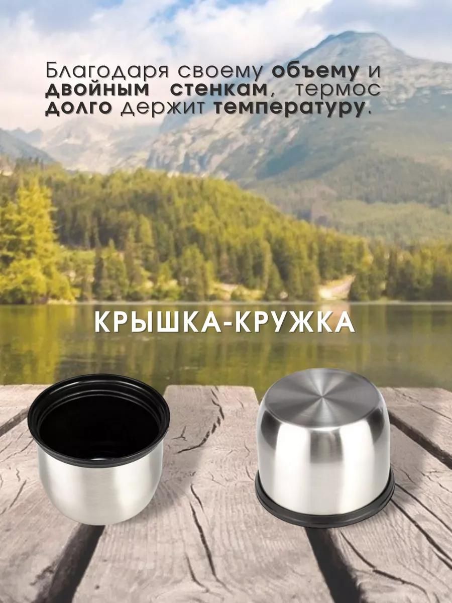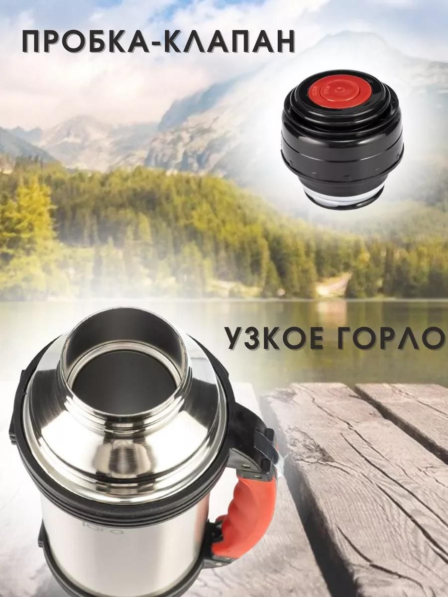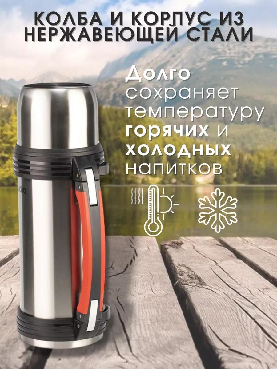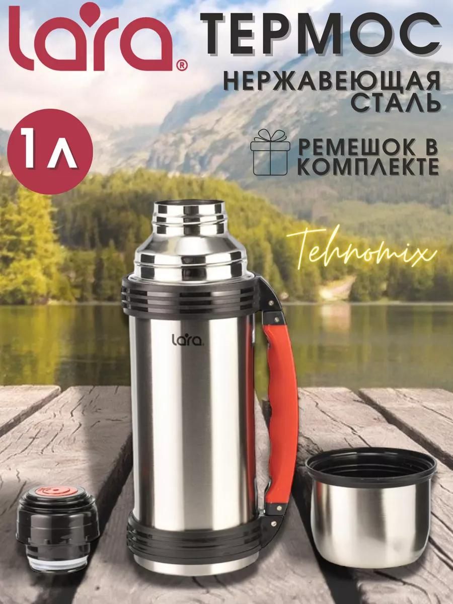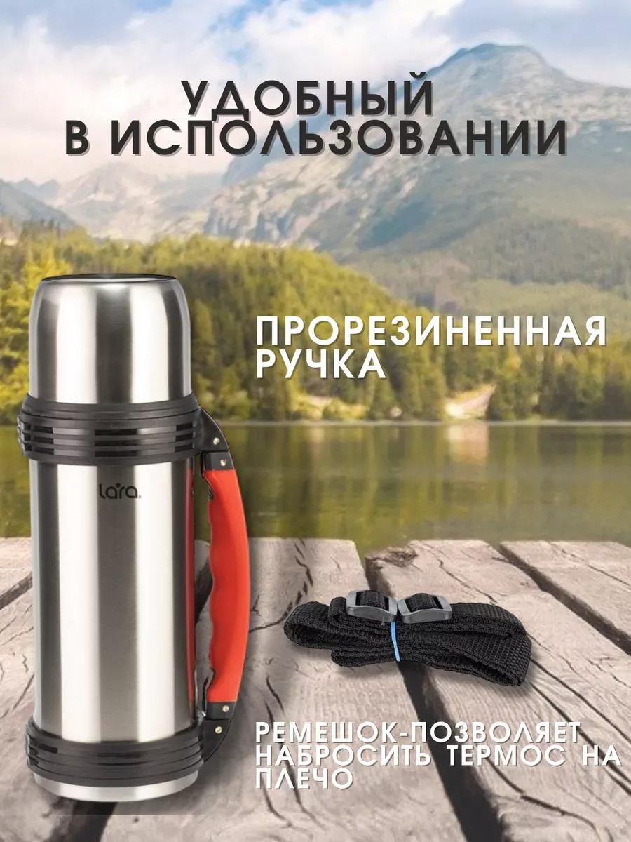 Корпус термоса изготовлен из высококачественной нержавеющей пищевой стали. Объем 1 литр. . Легкий и прочный. Благодаря двойным стенкам, термос сохраняет напитки и продукты горячими или холодными длительное время, ориентировочно 12 часов. Термос закрывается пробкой с надежным клапаном. Для удобства использования верхняя крышка может использоваться в качестве кружки. Термос этой модели имеет прочную, удобную прорезиненную ручку и ремешок для переноски. Изделия LARA соответствуют всем официальным национальным стандартам безопасности, применимым к посуде на территории Российской Федерации. Данное изделие рассчитано на долгий срок эксплуатации при соблюдении правил и рекомендаций указанных в гарантийном талоне. Термос подойдет для туризма, удобно для охоты и рыбалки, можно брать с собой каждый день на работу в офис и на прогулку, в школу, универсальный в любом походе. Зарекомендовал себя для зимних видов спорта и прочих разнообразных зимних активностях. Термос LARA согреет даже в самый лютый мороз. Летом также термос 1 литр станет приятным спутником на пляж и в жаркую летнюю прогулку, наши термосы отлично сохраняют холод. Прохладные соки, напитки, компоты останутся освежающе прохладными даже в самый жаркий день. Наш термос настоящий помощник для мам, его можно наполнить горячей водой на ночь для разведения молочной смеси. Кормление малышей ночью станет по настоящему комфортным и удобным. Наши материалы не влияют на вкусовые качества и запах напитков и еды. Безопасны при взаимодействии с горячими напитками и едой. Подходит для детей и детского питания. Полезный подарок на день рождения универсальный для каждого- для папы и для дедушки, для мамы и для сестры. Вместительный походный термос для напитков можно взять в машину. Небольшой литровый железный термос, термопосуда будет отличным спутником в путешествии или прогулках на свежем воздухе всей семьей. Можно использовать не только для напитков, но и для еды.