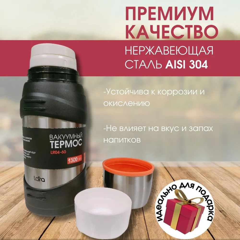 Термос LARA 04-60 1,3л, двойные стенки, пластиковая ручка/ремешок, сито для заваривания