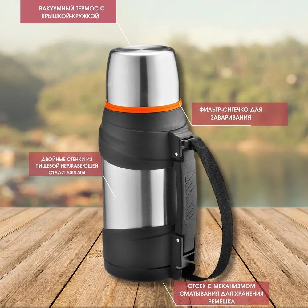 Термос с ситечком для чая, в котором удобно заваривать мелколистовой чай , травяной сбор и шиповник. Данный термос имеет пробку-клапан. Подходит для хранения чая с лимоном и ягодами. Витамин С не разрушается при взаимодействии с нержавеющей сталью. Наш термос настоящий помощник для мам. Термос можно наполнить горячей водой на ночь для разведения молочной смеси. Металлический термос выполнен из нержавеющей стали с двойными стенками, обеспечивает эффективное поддержание температуры жидкости внутри. Термокружка легко открывается и герметично закрывается благодаря силиконовому уплотнителю. Бутылка-термос не проливается, внутри закрыт вакуумной колбой. Отлично подойдет для чая, кофе и горячих напитков, чтобы не обжечься. В термосе можно заварить чай, кофе, ягоды, мяту, пуэр, улун, душистые травы. В жаркий солнечный день в термостакан можно налить лимонад, сок, компот, воду, напитки останутся холодными долгое время. Имеет ситечко-фильтр. Термос позволяет использовать его для различных пищевых продуктов, он легко моется и имеет продолжительный срок службы. Удобный и практичный термос для авто и поездок, походов и пикников, можно брать с собой в рюкзак, сумку, машину, на тренировку, на работу или в путешествие. Термос в авто упакован в плотную фирменную коробку. Это полезный подарок для членов семьи, молодого человека, любимой жены и мужа, родителей и коллег или руководителя и директора. Подарочная термопосуда обрадует автомобилиста, рыбака и охотника или тренера. Подарите ее отцу и сыну или дедушке с бабушкой, лучшей подруге с другом. Прорезиненная ручка с ремешком, снизу есть механизм для сматывания и хранения ремешка. В коллекции бренда термосы разного размера.